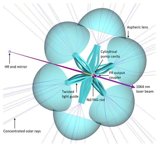 For a high focusing of the solar radiation into the Nd:YAG laser rod, six fused silica aspheric concentrators, and six twisted fused silica light guides were designed, as presented in Figure 2. Fused silica with high quality (99.999%) can be obtained through optical machining and polishing [56]. Its transparency over the visible region of the solar emission spectrum, low coefficient of thermal expansion, and high resistance to scratching and thermal endurance are optimal characteristics for Nd:YAG laser rod pumping. The six aspheric lenses were all equally designed to efficiently couple the concentrated solar radiation from the focal zone of each Fresnel lens onto the input face of each twisted light guide. Each optimized aspheric concentrator had 112 mm diameter, 53 mm height, −53 mm rear radius, and −0.150 rear conic value, and all were symmetrically positioned 96.5 mm away from the center of the laser head. An averaged transmission efficiency of 87% was numerically determined for the fused silica aspheric lenses, each one focusing 440 W solar power.