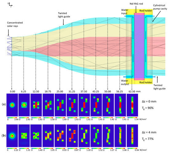Figure 4 gives the pump light distribution at several cross-sections for one twisted light guide. Maximum transmission is indicated with red color, whereas blue means almost none or zero pump light transmission. In order to obtain the maximum energy transmission, the optimum alignment between each aspheric lens and the input face of each light guide in the z-axis (∆z = 0) was determined. In this case, an averaged transmission efficiency of 90% was computed for the twisted light guides, each one delivering 396 W solar power into the cylindrical cavity (396 W × 6 = 2376 W total solar power). The contribution of the water layer was also included in the simulations, with the laser rod receiving at its surface a total of 1995 W concentrated solar power. However, about 50% of the energy was transmitted through the central section of each light guide, producing a non-uniform output power distribution, as demonstrated in Figure 4a. By shifting each aspheric lens by 4 mm upwards, it was possible to find a more uniform power distribution at the light guide’s output end (Figure 4b), but the misalignment significantly reduced the light guide’s averaged transmission efficiency to only 77%, and thus the shifting was not adopted.