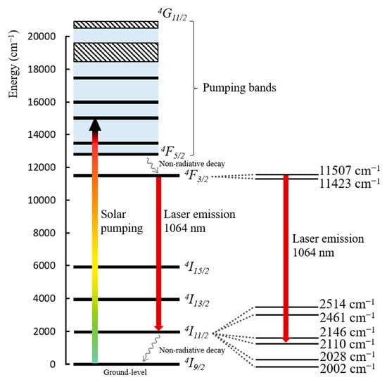 Different laser active materials can be used in order to directly convert broad-band sunlight into monochromatic radiation [57,58,59]. Despite the correlation between the solar spectrum and the absorption spectrum of Nd:YAG being only 16%, its extraordinary spectroscopical properties [60] and great thermomechanical characteristics [40] that provide resilience and durability, combined with its easy availability and relatively low cost, have attracted researchers to use this laser material in the extreme thermal and optical conditions of solar pumping. Moreover, the Nd:YAG laser is a four-level laser system. This means that the lower laser level is well above the ground state and is quickly depopulated by multiple phonon transitions, avoiding reabsorption of the laser radiation, reducing the threshold pump power, and consequently facilitating stimulated emission. As presented in Figure 5, the laser photons are typically emitted at a wavelength of 1064 nm, corresponding to the transition from the 4F3/2 to the 4I11/2 level [10].