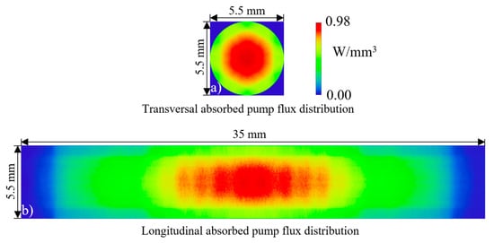 Absorbed pump flux distribution along both (a) transversal and (b) longitudinal cross-sections of the 5.5 mm diameter, 35 mm length Nd:YAG laser rod.