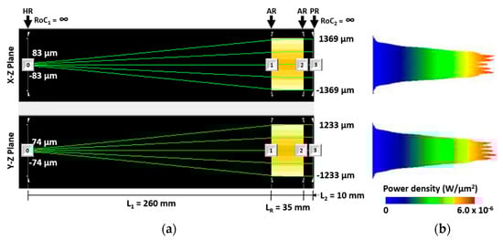 The adoption of an asymmetric resonator significantly enhances the pump and laser mode matching, providing high-quality laser beams [63]. As shown in Figure 7, L1 represents the distance from the HR mirror to the left end face of the laser rod, and L2 the distance from the right end face of the laser rod to the PR output coupler, with both being particularly important parameters in order to obtain optimum mode overlap. L2 was fixed at 10.0 mm, and L1 was optimized by LASCAD® software in order to achieve the highest pump and laser mode matching. The laser rod length is represented by LR. The radius of curvature of both the HR end mirror (RoC1) and a PR output coupler (RoC2) was also optimized. For the 5.5 mm diameter, 35 mm length rod, as indicated in Figure 7a, optimum laser design parameter was found at L1 = 260.0 mm. At the output mirror, a top hat profile with a maximum power density of 6.0 × 10−6 W/μm2 was verified, as shown in Figure 7b.