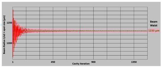 The beam waist was calculated by the beam propagation method (BPM) cavity iterations function of LASCAD® software for the top hat profile extracted from the 5.5 mm diameter laser rod within the laser cavity presented in Figure 7a. Figure 8 shows that the 1/e2 width beam waist value stabilizes at ω = 1233.0 μm.