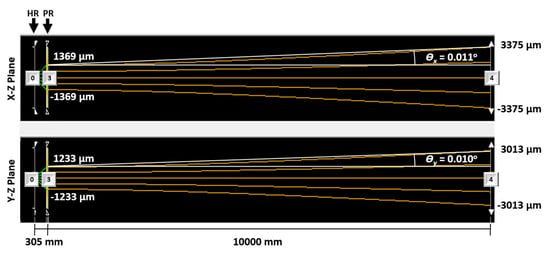 LASCAD® representation of the laser beam propagation through 10,000 mm vacuum. ϴx and ϴy represent the laser beam divergence half-angles at the X-Z and Y-Z planes, respectively.