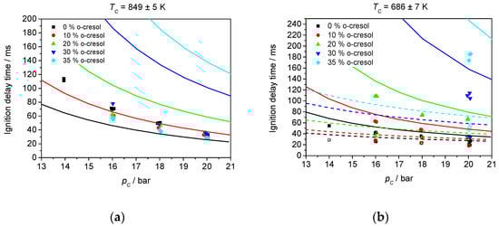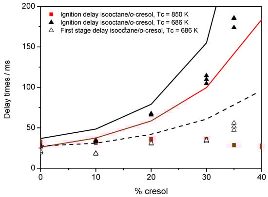 These conclusions can be generalized over a wide range of pressures, as demonstrated in Figure 3. The discrepancy between experimental and simulated ignition delays is consistent all over the investigated pressure range for pure iso-octane mixtures, with an underestimation of the IDT of about 30% at TC = 850 K, and a similar overestimation of both IDTs at TC = 686 K. While this remains true at all investigated ortho-cresol mole fractions for the lowest temperature, where two-stage ignition is observed, the model again overestimates the effect of ortho-cresol addition on the IDT at all pressures. Experimentally, the addition of ortho-cresol hardly modifies the IDT at TC = 850 K.