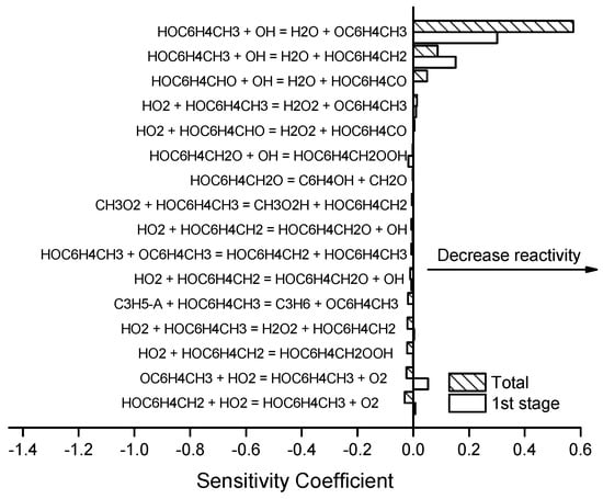 Because this study focuses on the co-oxidation of ortho-cresol in conditions where it will not show auto-ignition, the following discussion will examine further the TC = 686 K condition, where two-stage ignition takes place. A brute-force sensitivity analysis on the first-stage and total ignition delays has been performed and is shown in Figure 5. Because of the size of the mechanism and the focus on explaining the effect of ortho-cresol, this sensitivity analysis was performed only taking into account the submechanism for this species, as well as radicals R1 and R2, phenol, and the phenoxy radical. First, one can note that the two hydrogen abstraction reactions by OH leading to R1 and R2 have the highest sensitivity coefficient for both ignition delays. The fact that both have positive sensitivity coefficients illustrates that ortho-cresol acts mainly as a radical scavenger of OH, thereby reducing the reactivity in the low-temperature zone. This is also true for the hydrogen abstraction reaction by OH on ortho-hydroxybenzaldehyde, demonstrating the importance of this secondary species, which will be confirmed below. Moreover, the formation of R2 inhibits the reactivity more than the corresponding reaction forming R1. This can be explained by the fact that according to the simulations, R2 is mainly recycled into cresol, when R1 can undergo further reactivity with HO2 and O2. This creates a reactivity loop where R1 then reacts with HO2 to yield back ortho-cresol, and this reaction therefore shows a positive sensitivity coefficient on the first-stage ignition delay. This conclusion can however be toned down by the fact that further reaction pathways for radical R2, such as the ones yielding cyclohexa-3,5-dien-1-one described in [], are not present in the kinetic model. One can also notice the negative sensitivity coefficient of the HO2 addition reaction on radical R1. This results in the formation of a hydroperoxide which can readily decompose into a hydroxybenzoxy radical and an OH radical, therefore facilitating ignition by converting a relatively unreactive HO2 radical into more reactive radicals. The hydrogen abstraction reaction by HO2 that yields R1 however has a negative sensitivity coefficient on the total ignition delay while its sensitivity coefficient for the first-stage ignition delay is nearly equal to zero, showing that during the second stage of ignition (or in the intermediate temperature range) ortho-cresol can reduce the ignition delay by facilitating the conversion of HO2 into H2O2, whose decomposition into two OH radicals is commonly associated with the final ignition event.