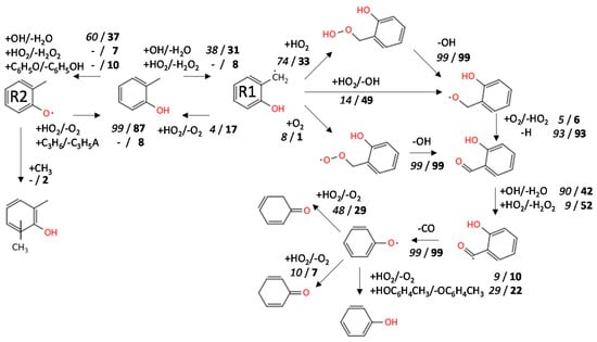 Rate of production analysis for the submechanism of ortho-cresol in the case of a stoichiometric 80/20 iso-octane/ortho-cresol blend at TC = 686 K. PC = 20 bar.Italic numbers correspond to 5% ortho-cresol conversion (i.e., first-stage ignition), bold numbers to 75% ortho-cresol conversion (i.e., final ignition).