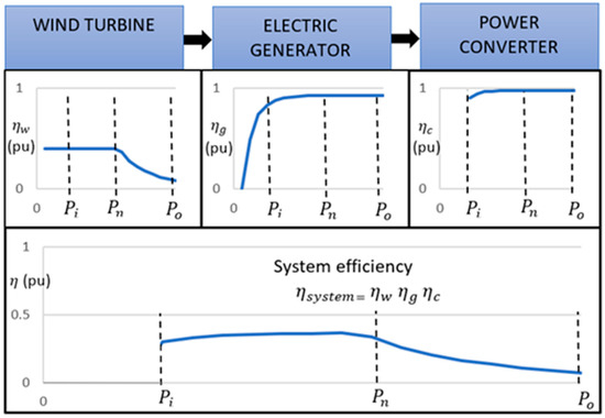 The output power of a wind turbine depends on the efficiency of each component (Figure 1). To maximize the efficiency of the system, the efficiency of the PMSG for wind turbines must be the maximum in the operation range which depends on initial power (pin) and the output power (pout).