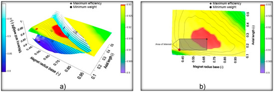 (a) Efficiencies behavior and weights of the electric generator with different dimensions. Area of the analysis delimited by the maximums and minimums points; (b) Interest area from the superior view (obtained from own simulations).