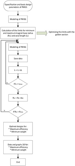 First, the PMSG parameters for each optimization criterion are determined through a simulation process, in this way the Rbi and L values for each optimization criterion that define the limits used for the implementation of the methodology are obtained using the numerical method of the golden section (Steps 1–3).