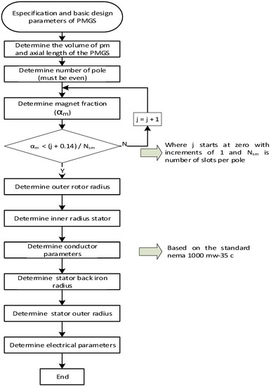 The methodology developed for the optimization is shown in the diagram of Figure 3 where the characteristics of the materials used are considered from the beginning as well as the design specifications for the PMSG (Pm, ωm, Rbimax, Rbimin, and others) which were obtained from the nominal wind speed of the turbine rotor.