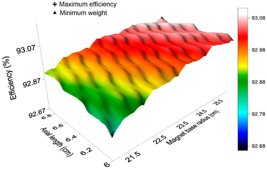 The general graphic of the efficiency behavior for the defined limits by the geometry dimensioning of the lower weight and major efficiency is shown in Figure 5. The radius of the magnet base varies from 21 to 26 cm and the axial length from 6 to 7 cm. Figure 5 shows the geometric limits with respect to the efficiency and there is a variation of 0.4% of the efficiency.