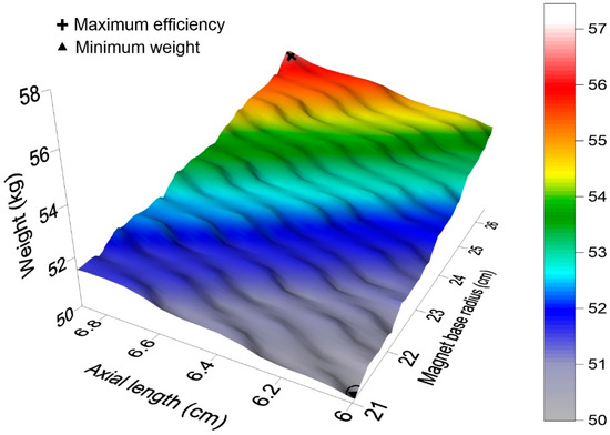 The general graphic of the weight behavior for the same limits established is shown in Figure 6. From this figure can be observed that the weight difference between the PMSG of the maximum efficiency and the PMSG of the minimum weight is 6.86 kg, which implies a difference of 12.16%.