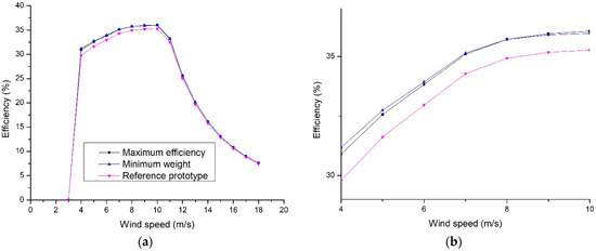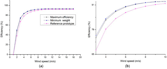 The total efficiency behavior of the wind turbine is shown in Figure 9a. This is obtained from the multiplication of their component’s efficiencies, namely generator, wind rotor, and inverter. Figure 9b showed that the efficiencies of wind turbines with the optimized PMSGs are higher than that of the reference PMSG for the nominal speed. These efficiency differences are 0.75% and 0.64% higher for the maximum efficiency optimized PMSG and the minimum weight-optimized PMSG respectively and the difference between them is 0.11%. The PMSG of minimum weight has higher efficiency for low wind velocities and therefore the energy use is improving.
