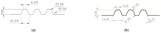 First, a metallic bipolar plate, made of 0.l5-mm-thick SUS 316L metal sheet [36], was fabricated via multiple progressing stamping functions to produce a straight cathode channel. Metallic bipolar half-plates with different fillet radii were also made via a constant stamping process with stamping dies at different angles. In the final stamping step, the deformed channel-shaped metallic sheets needed to be pressed again to ensure accurate channel height.
