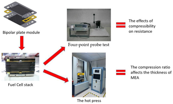 In this step, we prepared the bipolar plate modules for assembly of the FC stack. We measured the resistance of the bipolar plate modules with the four-point probe method and then used a hot press to set different compression ratios for the measurement of the thickness. The measuring equipment and assembling steps are shown in Figure 4.
