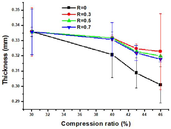 As shown in Figure 5, with the compression ratio at 30%, there was no significant difference in the average MEA thickness as compared to the 40% compression ratio, for which the thickness difference was 104.6% at R = 0 mm, 104.3% at R = 0.3 mm, 104.3% at R = 0.5 mm, and 101.5% at R = 0.7 mm. With the compression ratio at 43%, the thickness difference was 108.7% at R = 0 mm, 103.3% at R = 0.3 mm, 104% at R = 0.5 mm, and 104.3% at R = 0.7 mm, as compared with the 46% compression ratio, for which the thickness difference was 111.6% at R = 0 mm, 104% at R = 03 mm, 105% at R = 0.5 mm, and 105.6% at R = 0.7 mm. With the value of R set at 0 mm, the compression ratio remained unchanged; the other three values (R = 0.3, 0.5, 0.7 mm) had the largest difference in MEA thickness (111.6%), while the thickness difference was the smallest (104%) at R = 0.3 mm.
