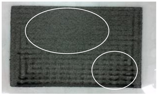 Regarding the compression ratio of MEA featuring a channel shape without a fillet radius (i.e., R = 0 mm), the total thickness was found to mostly be caused by non-proportional deformation triggered by the GDL with a carbon fiber structure. The channel surface with a metal fillet radius was forced to bend locally at R = 0 mm, because of which the carbon fiber deformed through bucking and exhibited lower total thickness under higher compression ratios (Figure 5). Figure 6 shows the imprints of the anode serpentine channel and the straight cathode channel on the GDL surface. The upper left corner of the figure exhibits deformation marks caused by excessive pressure and the lower right corner displays the usual marks.