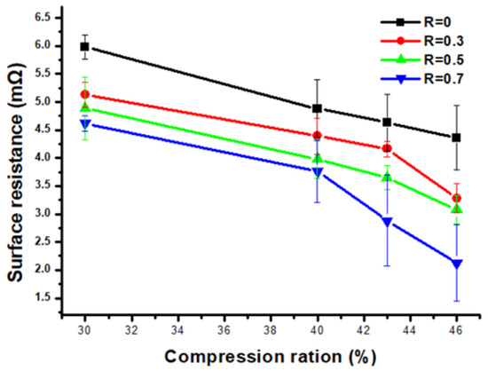 Figure 7 displays the relationship between the compression ratios (in this section, the study analyzes the contact resistance at compression ratios of 30%, 40%, 43%, and 46%). Therefore, to obtain a significant value, compression force was employed with different sized radii, with variations in the ratios of the percentage values of contact resistance. The ratio percentage can be shown as a non-unit value to indicate a smaller value with difference R-versus-compression ratios and resistance for difference fillet radii (0, 0.3, 0.5, and 0.7 mm), with an overall compression ratio of 53%. The resistance with a characteristic angle of 0 mm at 30% compression stood at 5.98 mΩ, as compared with 4.62 mΩ for 46% compression. The resistance was reduced by 29.4%. The resistance with a characteristic angle of 0.5 mm at a 30% compression ratio dropped to 4.88 mΩ, as compared with 2.88 mΩ for the 46% compression rate, with a 69% reduction in resistance. The resistance with a characteristic angle of 0.7 mm at 30% compression dropped to 4.62 mΩ, as compared with 2.13 mΩ for 46% compression. With the overall compression ratio remaining at 53.3%, resistance was reduced by 116.9%. In general, with a 30% compression ratio, the resistance difference between characteristic angles 0 mm and 0.7 mm reached 29%; with a 46% compression ratio, the difference in resistance between the distinct angles of 0 mm and 0.7 mm came to 104.69%.
