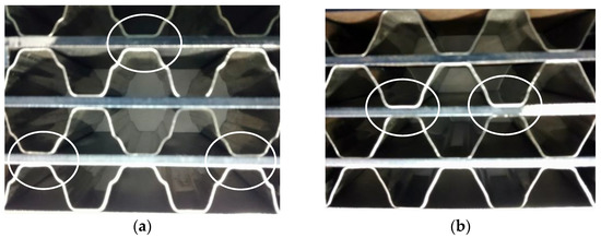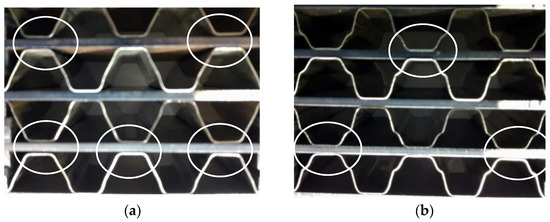 A characteristic angle was added to the optimal design, thereby increasing the average contact surface between the runner and the MEA and, as a result, reducing the contact resistance. Without a characteristic angle, the contact resistance continued to drop. Then, the compression ratio was increased. In this case, the MEA may have incurred excessive pressure, which would have resulted in regional damage, risking a substantial drop in the efficiency of the fuel cell stack. Therefore, in this study, different characteristic angles were selected to compare their differences. Figure 8a includes a comparison between various characteristic angles for 0 mm with a 30% compression rate, while Figure 9b shows a similar comparison for 0 mm with a 46% compression rate. There were apparent voids on the contact surface of the metal bi-level plate. At higher compression ratios, gaps were significantly reduced (Figure 5) and the contact resistance was lower. Figure 9a shows that at the 0.7 mm characteristic angle with a 30% compression rate, the contact surface of the metal double-stage plate was relatively flat with no noticeable gap, as compared with that in Figure 8a. The contact surface was even flatter at a characteristic angle of 0.7 mm with a 46% compression rate, as shown in Figure 9b. Figure 7 displays the phenomenon of resistance. With the same compression ratio, a better contact resistance could be derived from an appropriate characteristic angle. It was found that, in general, MEA pressure can be reduced with a right angle, thereby increasing the reliability of fuel cell stack based on the presence of a lower clamping force.
