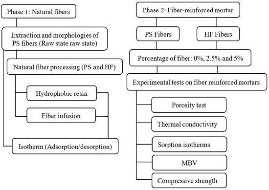 The hygrothermal behavior, porosity, sorption/desorption isotherms, specific heat, moisture buffer value (MBV), and compressive strength of the investigated mixtures were determined. The experimental program carried out in this study is shown in Figure 1.