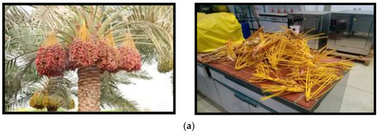 Different extraction steps of palm fibers. (a) Salvaged date stems; (b) cut palm stalk; (c) mill components; (d) palm stem fibers.