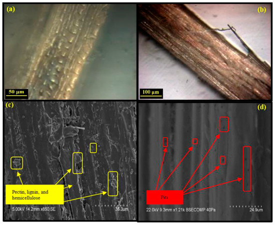 SEM images of PS fibers, including (a) rough surface of the fiber; (b) longitudinal section of unit fibers; (c) presence of lignin, pectin, and hemicellulose particles; (d) presence of cavities on the surface of the fibers.