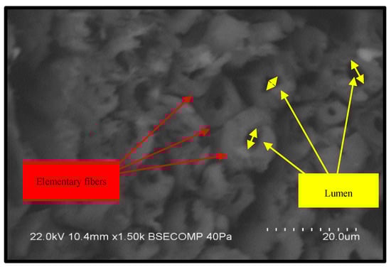 The microscopic evaluation (Figure 3) revealed a rough and porous structure with the presence of lignin, hemicellulose, and pectin on the fiber’s surface. As can it be observed in the SEM image (Figure 3c), lignin, hemicellulose, and pectin are deposited on the surface of the cellulose fibers. Furthermore, the image shown in Figure 3d reflects the presence of cavities in the cellulose fibers. According to literature [34], the pores of the flax shives are organized in parallel capillaries and oriented in the direction of vegetable growth. Additionally, these capillaries are connected to each other by small cavities. This porous and complex structure allows the damping of heat transmission in the flax shives, which consequently gives it a low thermal conductivity, but higher water absorption and transfer capacities. It is expected that the incorporation of these vegetable particles in hydraulic matrix can therefore improve the hydrothermal behavior of the composite and increase its porosity. The cross-section of PS fibers shown in Figure 4 comprises many elementary fibers. The observed cross-section of PS fibers is almost similar to the coir fibers [50].