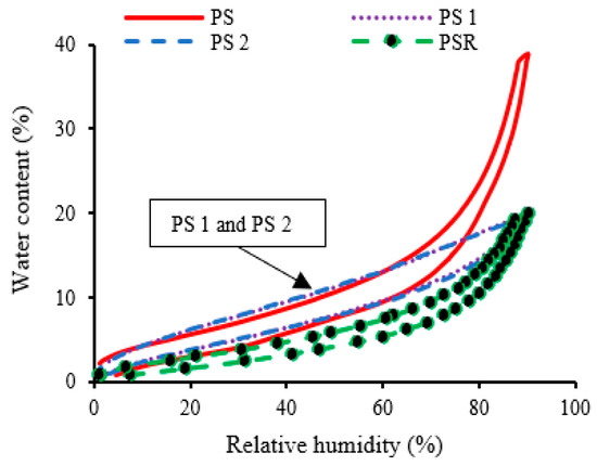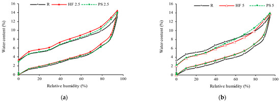 For each mixture, sorption/desorption isotherms were measured on two different samples. The sorption/desorption isotherm curves for the investigated mortar mixtures containing 2.5% and 5% PS and HF fibers are shown in Figure 9. It can be stated that the incorporation of fibers significantly affects the maximum absorbed water content. For example, at 94% of relative humidity, an increase in water content of 2.5% and 7.0% was observed for PS2.5 and HF2.5 mixtures compared to the reference mortar, respectively. The same trend was also observed for the fiber mortar made with 5% of fibers. This is due to the presence of highly hygroscopic materials which can absorb two to three times their weight at saturation. However, the increase in fiber dosage from 2.5% to 5.0% did not result in a significant difference. This may be due to the high heterogeneity of the materials and poor distribution of the fibers in the matrix. Moreover, the adsorption capacity of fiber reinforced mortars does not only depend on the fiber content. For example, porosity is a parameter that affects the adsorption of the mortar. In the case where the pores of the materials are emptied of air and filled with water, this results in a higher adsorption rate.