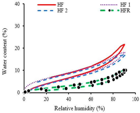 Sorption isotherms of HF fibers. It is worthy to mention the fiber’s abbreviations, as follows: PS/HF corresponds to the raw fibers (i.e., without treatment), PS1/HF1 corresponds to the treated fibers after the first infusion and PS2/HF2 after the second infusion, and PSR/HFR are those impregnated in resign.