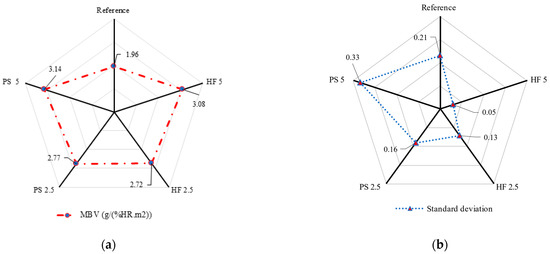 The obtained results revealed the good behavior of the investigated fiber mortar mixtures to the moisture variation. Indeed, MBV greater than 2 [g/(%HR·m2)] corresponds to excellent moisture regulator materials according to the Nordtest classification. These results are in good agreement with those reported in literature [34,51,52]. Bio-based materials, including flax and hemp concrete, are shown to be excellent moisture regulators. The fiber content (PS and HF) considerably increased the MBV of the investigated fiber mortar mixtures. Indeed, the use of 5% of PS and HF fibers increased the MBV from 1.96 to 3.14 and 3.08 [g/(%HR·m2)], respectively. This suggests the ability of fiber mortar to regulate humidity variations in living environments. Furthermore, the different mixtures investigated in this study showed a low standard deviation (Figure 10b) and, therefore, good repeatability.