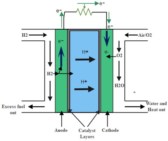 A PEMFC is compounded of two electrodes, an anode and a cathode, as well as an electrolyte between them, as depicted in Figure 1 []. The chemical reactions start with the hydrogen () converted at the anode to ions () and electrons () based on the catalyst layer action, as described in (1). Afterward, both and move to the cathode through the electrolyte and the external circuit, respectively. Thereafter, to generate water and heat, the protons and electrons react together with the oxygen in the catalyst layer of the cathode, as also depicted in Figure 1 and described in (2); meanwhile, liberated electrons move through the external circuit and generate electricity. Ultimately, the overall reactions are described in (3) [,].