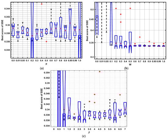 The classical GTO has three parameters, p, W, and , that have to be accurately picked to maximize its performance. Therefore, extensive experiments have been conducted using various values for each parameter. For example, the best value for both p and W has been picked after conducting extensive experiments with various values of 0.0, 0.01, 0.05, 0.1, 0.2, 0.3, 0.4, 0.5, 0.6, 0.7, 0.8, 0.9, 0.99, and 1.0, which show that the best value for p is of 0.01, as depicted in Figure 3a, while the best for W is competitive for 0.6, 0.8, and 0.99. Generally, values of 0.01 and 0.8 are used within the conducted experiments next for p and W, respectively. Likewise, for the parameter , several experiments have been conducted under virus values, and their outcomes have been depicted in Figure 3c, which shows that a value of 2 for this parameter is better than all the other values.