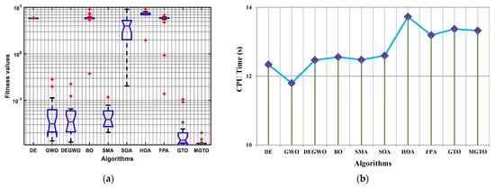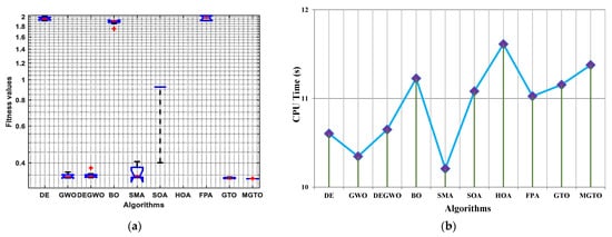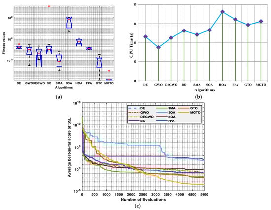 To measure the convergence speed, five-number summary, and CPU time of the MGTO, Figure 4 is presented to expose all those outcomes for each algorithm. From this figure, it is observed that the MGTO is the best in terms of faster reaching the near-optimal solution and the five-number summary depicted in the boxplot. Broadly speaking, Figure 4a, which depicts the outcomes of various algorithms on this test case using the boxplot, shows that the proposed algorithm is the best, and the GTO is the second-best one, while the SOA is the worst one. Regarding the convergence speed shown in Figure 4c, the MGTO could come true with the best convergence speed, and the GTO is the second-best one, while the FPA is the worst one. For CPU time depicted in Figure 4b, the MGTO could come as the eighth one after the GWO, DEGWO, DE, FPA, SMA, SOA, and BO, but its superiority for the other metrics, apart from converging the CPU time with the best eight algorithms, makes it the best for tackling this problem.