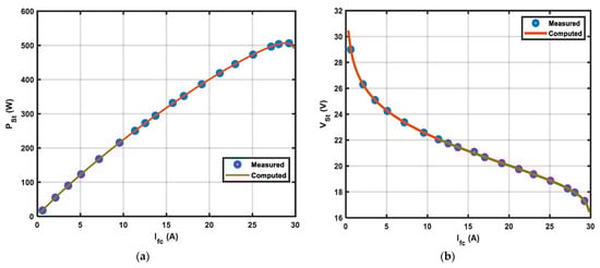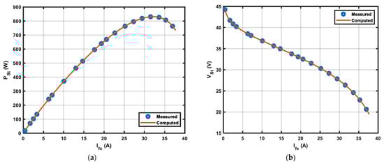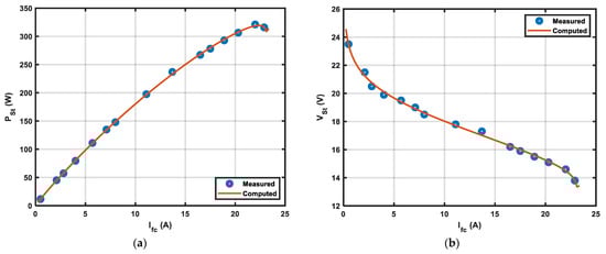 Depiction of I–V and I–P curves obtained using MGTO on test case 3: (a) I–P measured against I–P computed, (b) I–V measured against I–V computed.