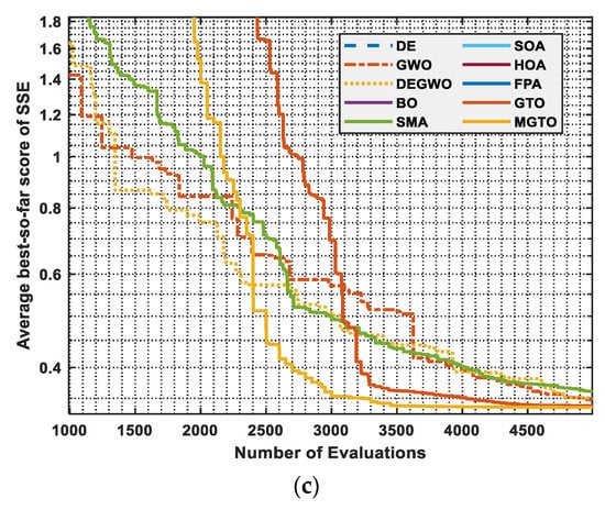 Furthermore, Figure 5a,b depicts the I–V and I–P polarization curves obtained by depicting the estimated and measured data; the best-so-far parameters estimated by the MGTO receive the estimated data points. From this figure, the MGTO could significantly find accurate parameters that minimize the error between measured and estimated data.