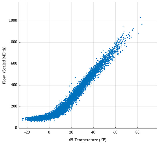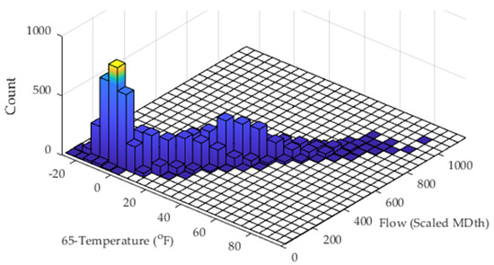 Temperature can also be adjusted to be more predictive of gas demand. HDD, see Equation (1) above, is a temperature adjustment that takes advantage of the linear relationship of gas demand and temperatures below 65 °F. Temperature is highly correlated with natural gas consumption below 65 °F, as illustrated in Figure 1 below. The portion of the graph with temperatures less than 65 °F represents the effects of space heating or the heat load. The portion of the graph greater than 65 °F represents the baseload, where the baseload includes water heating and industrial use of natural gas. The use of natural gas for heating above 65 °F is minimal. For temperatures below 65 °F, there is a linear trend with an r2 of −0.98, which indicates that as temperature decreases, natural gas consumption increases. Other weather variables such as wind do not have as high a correlation with natural gas consumption with an r2 of 0.22. However, the wind can be used as an adjustment for temperature [12], as can prior day temperature [13], and solar radiation [9]. Figure 2 below illustrates the lack of data at extremely low temperatures and flows, as seen on the right-hand side of the figure. This dearth of data at the extremes, which is exactly where the design day conditions occur, further indicates the need for weather generators such as our SWR.