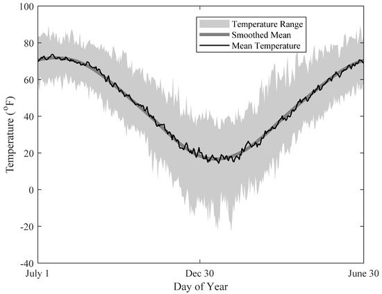 Nt and σt are deterministic, seasonal, and repeated annually. The scaled deviation from normal temperature, εt, is the stochastic component of the model that is resampled, as explained below in Section 3.2. Nt and σt are calculated from a temperature time series. Given a long temperature time series, generally exceeding 50 years, the mean temperature for each day of the year (i.e., 30 December) is calculated as shown in Figure 3 below. This mean temperature is smoothed using a fifth-order Fourier series as a low pass filter to produce Nt. Such Fourier series smoothing of mean temperature to yield normal temperature is a common technique [23,24,25].