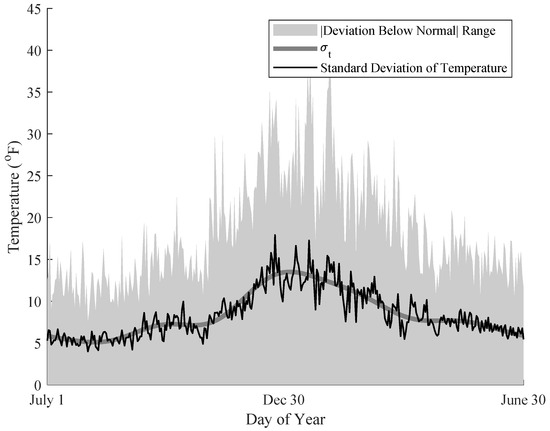 The term σt is analogous to the daily temperature standard deviation but has three important transformations from the daily temperature standard deviation. First, the mean for each day of the year is replaced by Nt, which is the smoothed mean. Second, only temperatures colder than Nt are used in the calculation. As the temperature range in Figure 3 demonstrates, the variance of colder-than-normal temperatures is not necessarily equal to the variance of warmer-than-normal temperatures, which is particularly true in the winter. Moreover, the design day must occur on a day colder than normal, so the “lower” deviations are of primary interest. Let Tt be the temperatures on the tth day of the year, be those temperatures less than Nt, be the mean of , and nt be the number of temperatures from the tth day of the year, then