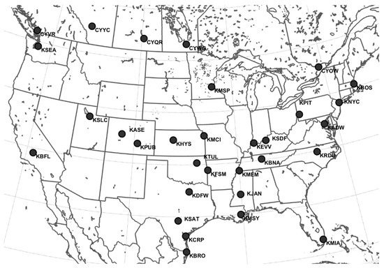 Thirty-three stations across the United States and Canada were examined for testing the performance of the weather generators (see Table 2 and Figure 5). The stations were chosen for geographic diversity and dataset length. All stations recorded data from 1950 to 2018. Station data are acquired primarily through NOAA [21] and is available publicly. The NOAA data are supplemented with data from AccuWeather, where NOAA lacks history.