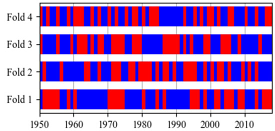 For each station, a 50-fold Monte Carlo cross-validation was performed [30]. Each fold randomly samples 30 years (without replacement) for the test set. The remaining years were used for the training set. An example of how the train and test data might be split for the first four folds is shown in Figure 6. Ideally, we would be able to perform cross-validation using a causal schema (the test set is chronologically after the training set). However, due to the small amount of data present relative to the extreme conditions being estimated, we used Monte Carlo cross-validation; it allowed us to perform enough folds to achieve a statistically significant result.