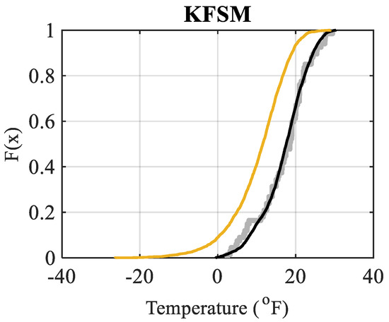 CDF of the annual coldest temperatures for station KFSM. The measured annual coldest temperature cdf (grey) is compared to the coldest annual temperatures generated by SWR (black) and WeaGETS (gold). For SWR, the KS-Test accepts that the measured and generated distributions are the same. This is observed by the close correspondence between measured coldest temperature cdf (grey) and the coldest annual temperatures generated by SWR (black). WeaGETS (gold) fails to capture the coldest temperature cdf, and the KS-Test H0 is rejected for WeaGETS. i.e., the generated data do not match the measured distribution.
