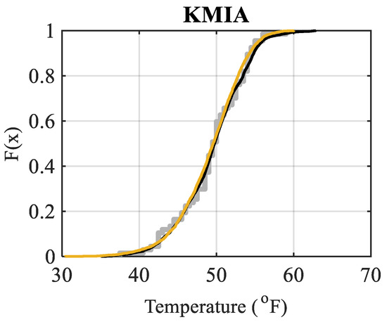 CDF plot of annual coldest temperatures for station KMIA. The measured annual coldest temperature cdf (grey) is compared to the coldest annual temperatures generated by SWR (black) and WeaGETS (gold). KMIA is the only station for which the KS-Test is accepted by both methods, i.e., the generated data are not significantly different from the empirical.