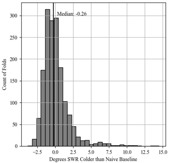 One of the motivations for the out-of-sample test is to demonstrate the difference between the naïve benchmark and the SWR. In other words, what is the impact that the SWR has on the 1-in-N temperature? To this end, the differences between the 1-in-N temperatures generated by the SWR and the naïve benchmark were calculated for all folds and all stations. The histogram of these differences is displayed in Figure 9. The standard deviation is 1.9 °F, which can make a large difference in design day planning. For example, the naïve benchmark and the SWR estimated 1-in-30 conditions with an average difference of 1.4 °F for KSAT. This roughly corresponds to a 3% difference in heat load. Therefore, estimating the 1-in-30 conditions using temperatures generated by the SWR does make a substantial difference.