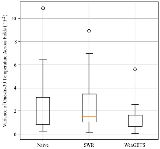 Variance of 1-in-30 temperatures across folds. For each station, the variance of the 1-in-30 temperatures is calculated. Variance represents sensitivity to new data. The naïve benchmark and the SWR have the largest spread with a mean variance of 2.4 °F2. WeaGETS has the lowest variance at 1.3 °F2.