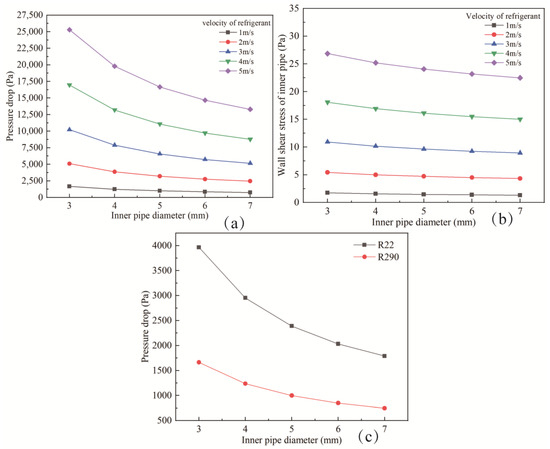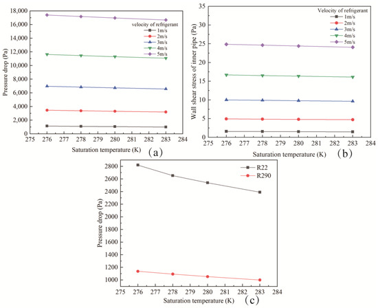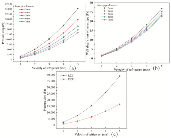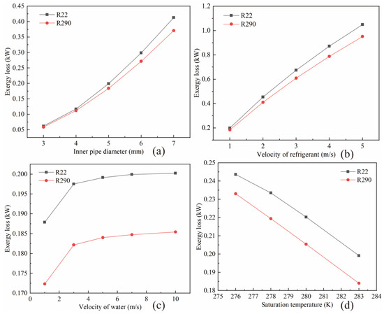 - With the operating conditions being the same, the exergy loss and pressure drop of R290 are 4.3–10.2% and 57.3–59.7% lower than that of R22, respectively.
