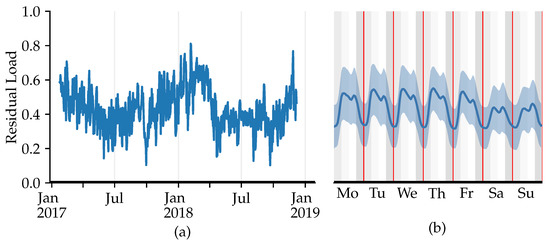 Figure 1 shows a recurring pattern of significantly higher energy demand for the winter months and lower consumption levels for the summer months. The daily peak load is measured in the morning hours on weekdays and in the evening hours on weekends, while the weekends show a lower load than the weekdays. The augmented Dickey–Fuller (ADF) test, conducted using Python 3.9 with the