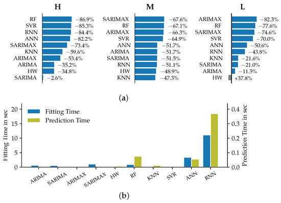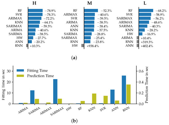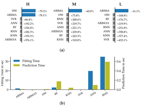 27]. We derive from these observations that for the VSTLF case no exogenous variables should be included as part of the forecast. Regarding the model selection, we recommend the consideration of ARIMA and Holt–Winters models for the time horizon of up to one hour. These observations can confirm previous findings, e.g., the results of empirical studies conducted by [