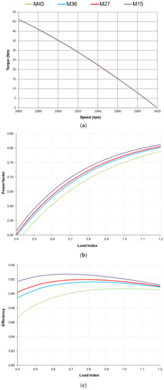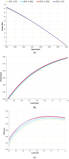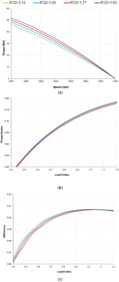 Figure 3 shows the results obtained in the characteristic curves with the modifications proposed in Table 4, based on the resolution of the equivalent circuit and applying the power balance in the motor. Mechanical losses and additional load losses have not been considered in this calculation procedure. The ratio of the output power developed by the motor concerning the nominal output power has been used as the load index. It is observed that the most remarkable effect in these curves is in the efficiency improvement.