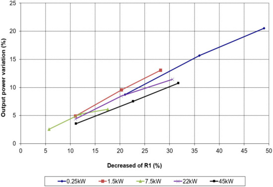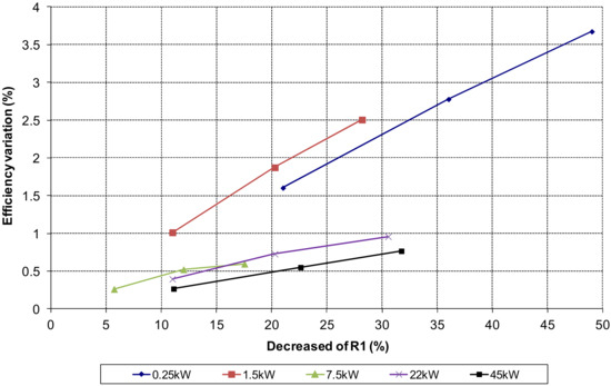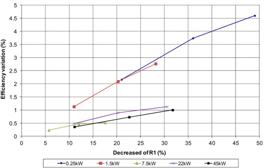 Efficiency variation versus decreased of R1 in all the motors (equal output power criteria).