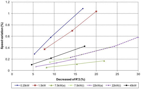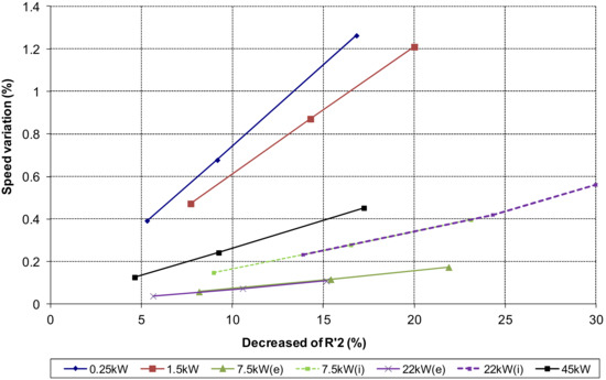 Speed variation versus decreased of R′2 in all the motors (in the double cage motors, subscript e for external cage variation and subscript i for internal cage variation is used) (equal output power criteria).